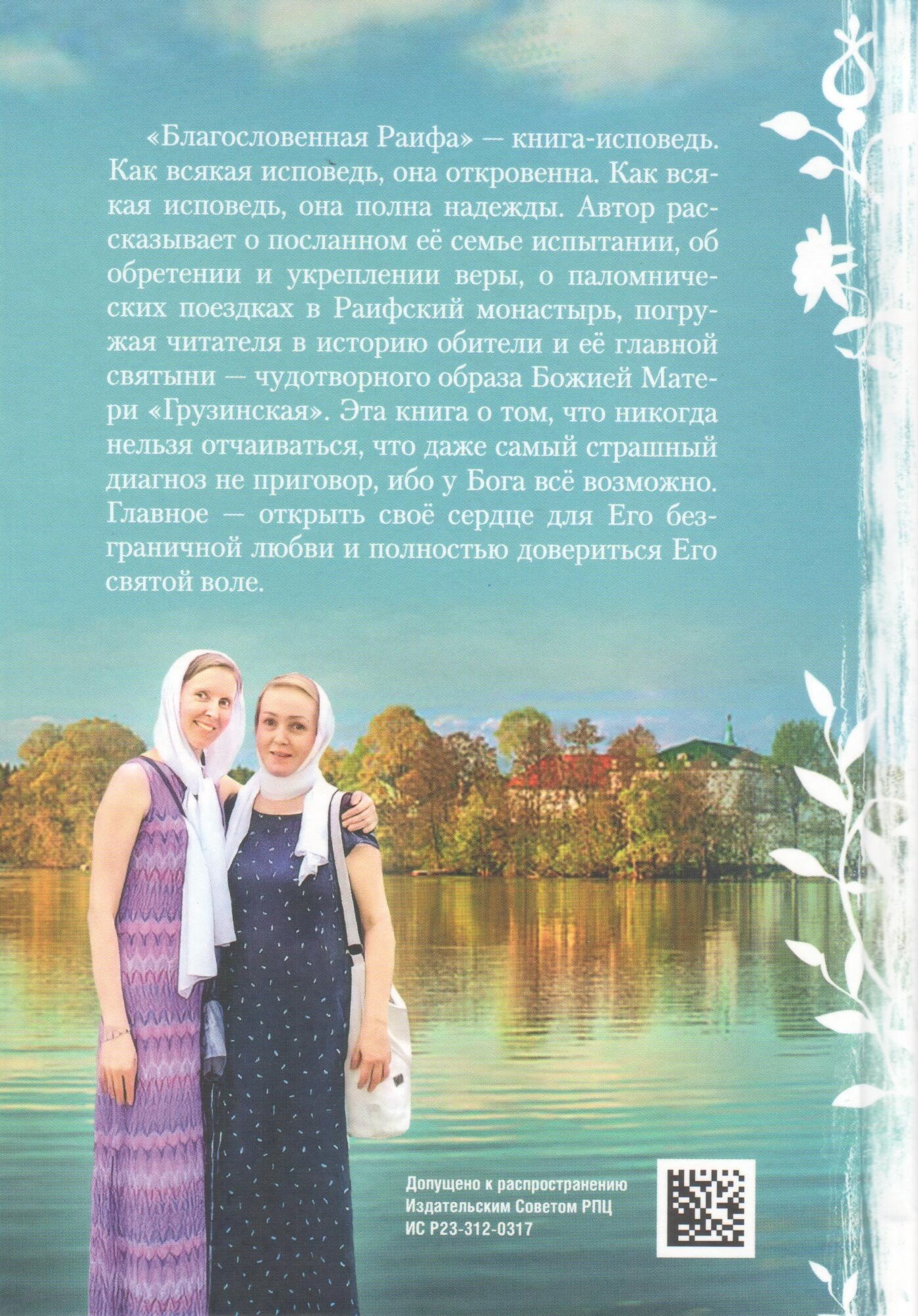 "Благословенная Раифа" - книга-исповедь. Как всякая исповедь, она откровенна. Как всякая исповедь, она полна надежды. Автор рассказывает о посланном её семье испытании, об обретении и укреплении веры, о паломнических поездках в Раифский монастырь, погружая читателя в историю обители и её главной святыни - чудотворного образа Божией Матери "Грузинская". Эта книга о том, что никогда нельзя отчаиваться, что даже самый страшный диагноз не приговор, ибо у Бога всё возможно. Главное - открыть своё сердце для Его безграничной любви и полностью довериться Его святой воле.