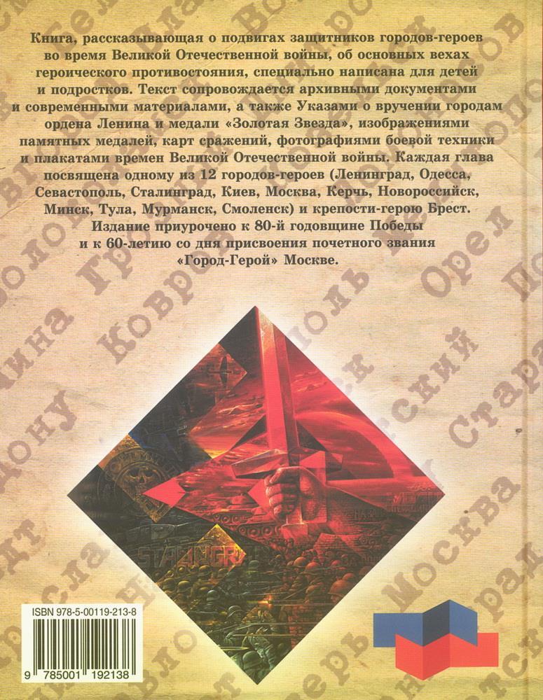 Книга, рассказывающая о подвигах защитников городов-героев во время Великой Отечественной войны, об основных вехах героического противостояния, специально написана для детей и подростков. Текст сопровождается архивными документами и современными материалами, а также Указами о вручении городам ордена Ленина и медали "Золотая Звезда", изображениями памятных медалей, карт сражений, фотографиями боевой техники и плакатами времен Великой Отечественной войны. Каждая глава посвящена одному из 12 городов-героев (Ленинград, Одесса, Севастополь, Сталинград, Киев, Москва, Керчь, Новороссийск, Минск, Тула, Мурманск, Смоленск) и крепости-герою Брест. Издание приурочено к 80-й годовщине Победы и к 60-летию со дня присвоения почетного звания "Город-Герой" Москве.