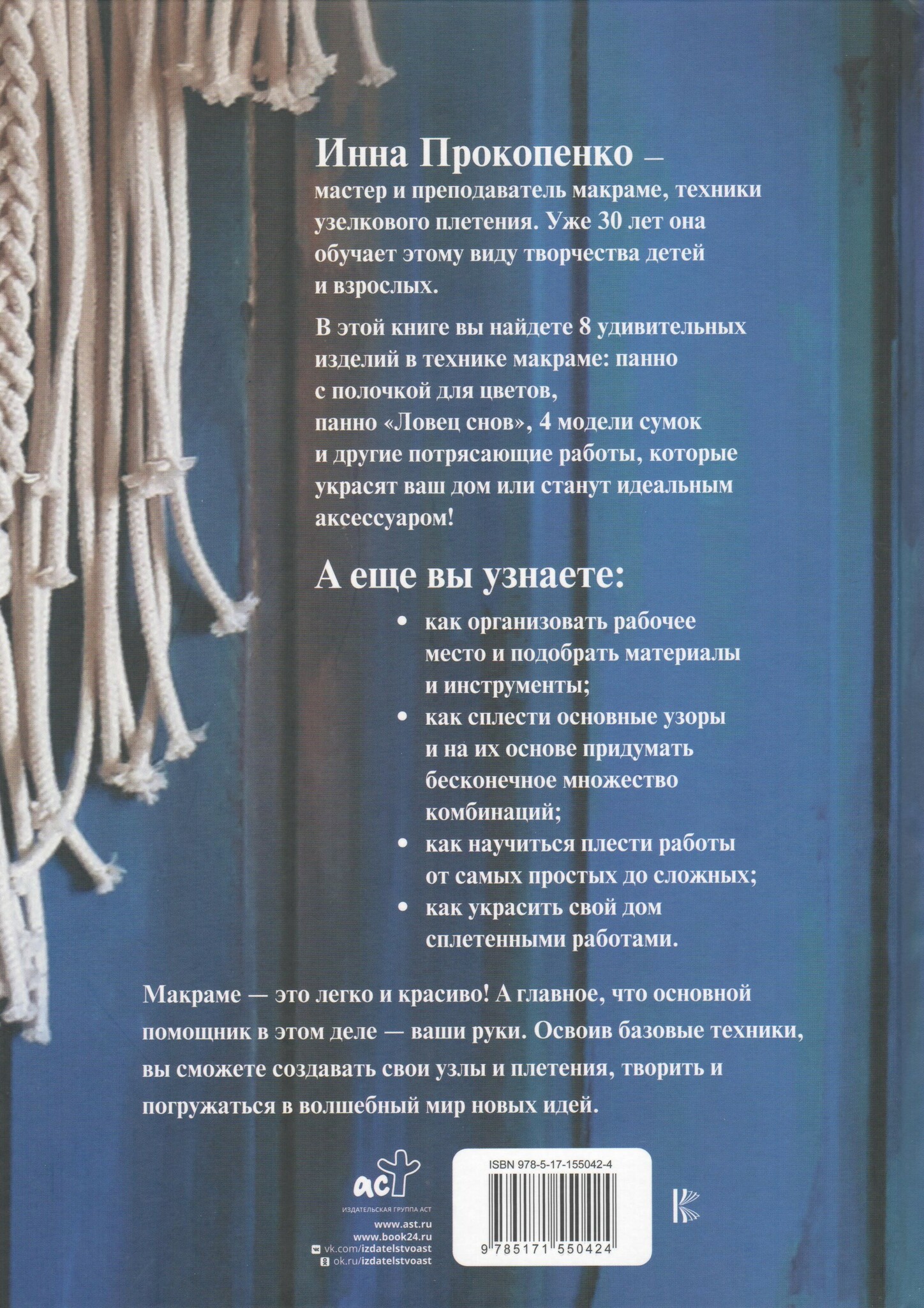 В этой книге вы найдете 8 изделий в технике макраме: разнообразные панно, сумки и другие работы, которые украсят ваш дом или станут идеальным аксессуаром! Вы узнаете, как организовать рабочее место, подобрать инструменты и материалы, сплести основные узоры и украсить дом готовыми работами. Освоив базовые техники, подробно описанные автором, вы сможете создавать свои узлы и плетения, творить и погружаться в волшебный мир новых идей.