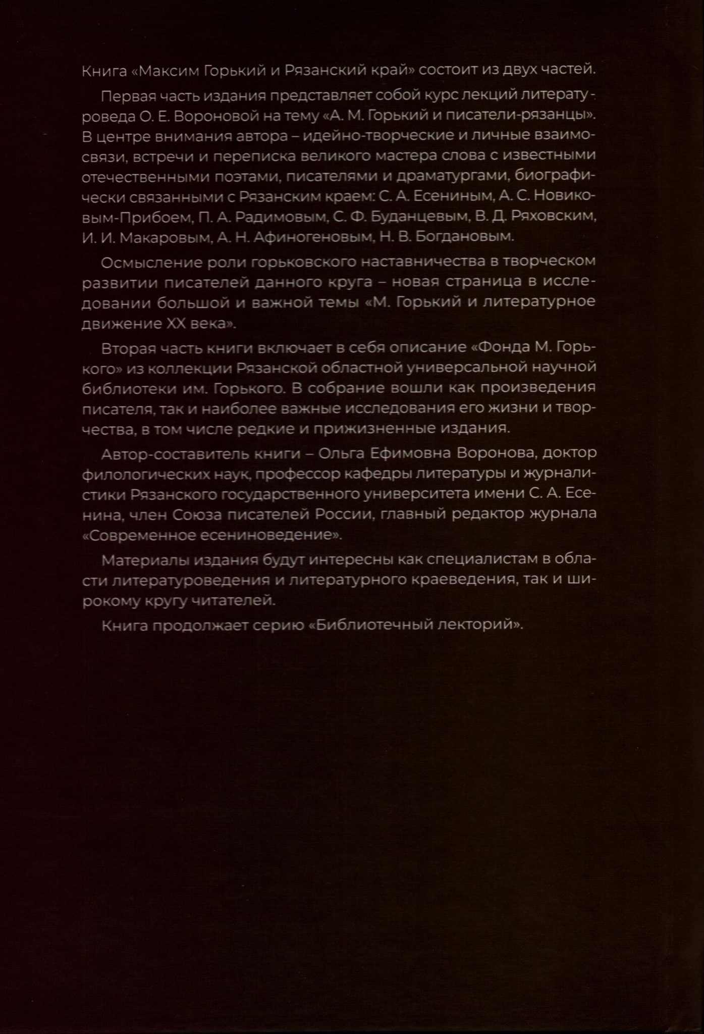 Первая часть книги представляет собой курс лекций литературоведа О. Е. Вороновой на тему "А. М. Горький и писатели-рязанцы". В центре внимания автора - идейно-творческие и личные взаимосвязи, встречи и переписка великого мастера слова с известными отечественными поэтами, писателями и драматургами, биографически связанными с Рязанским краем: С. А. Есениным, А. С. Новиковым-Прибоем, П. А. Радимовым, С. Ф. Буданцевым, В. Д. Ряховским, И. И. Макаровым, А. Н. Афиногеновым, Н. В. Богдановым.