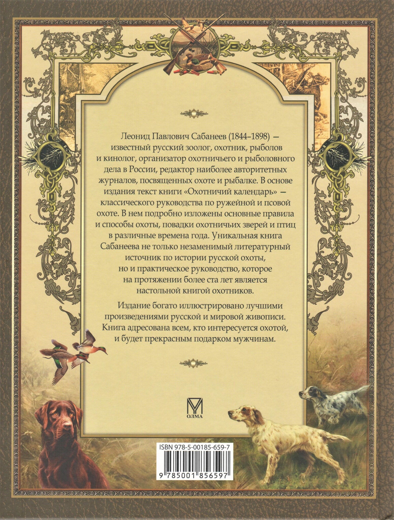 Леонид Павлович Сабанеев (1844–1898) — известный русский зоолог, охотник, рыболов и кинолог, организатор охотничьего и рыболовного дела в России, редактор наиболее авторитетных журналов, посвященных охоте и рыбалке. В основе издания текст книги «Охотничий календарь» — классического руководства по ружейной и псовой охоте. В нем подробно изложены основные правила и способы охоты, повадки охотничьих зверей и птиц в различные времена года.