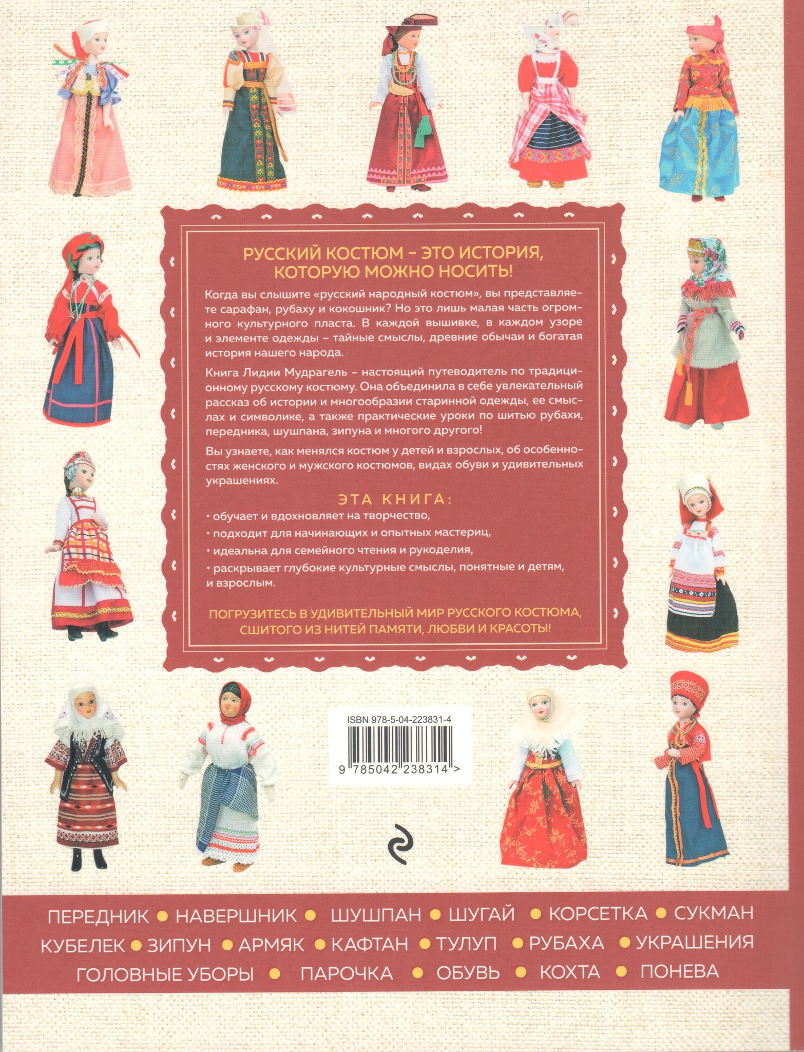 Книга автора множества бестселлеров Лидии Мудрагель объединяет в себе увлекательный рассказ об истории и многообразии русского костюма, его смысле и символике и практические уроки по созданию отдельных предметов одежды с шаблонами и инструкциями, которые могут пригодиться, если вы захотите сшить их самостоятельно.