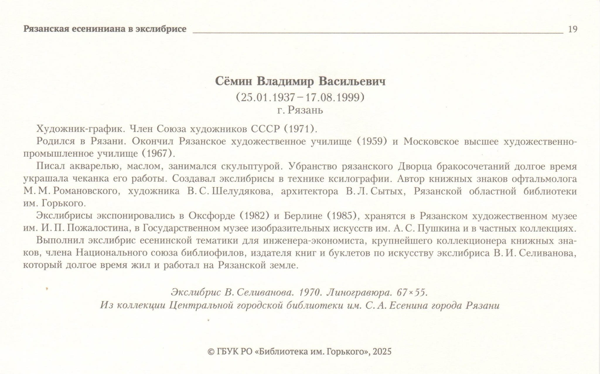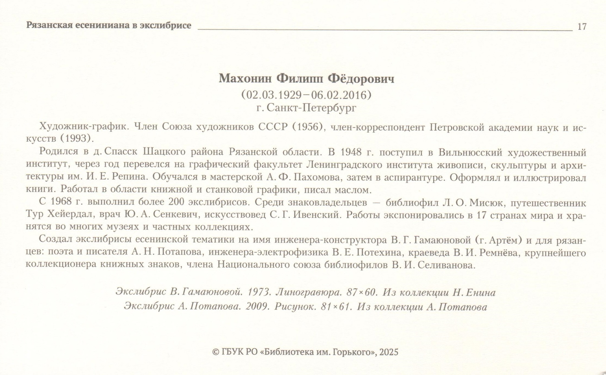 38 есенинских экслибрисов - от шедевров до скромных произведений художников-любителей - представлено в данном комплекте открыток. Среди них - 9 новых работ шести рязанских авторов. Описания этих экслибрисов помечены на открытках звездочкой. Кроме того, в издание включен малоизвестный книжный знак, созданный Ф. Ф. Махониным для своего двоюродного брата В. Потехина. Большинство графических миниатюр выполнены для личных библиотек рязанцев, поклонников творчества Сергея Есенина.