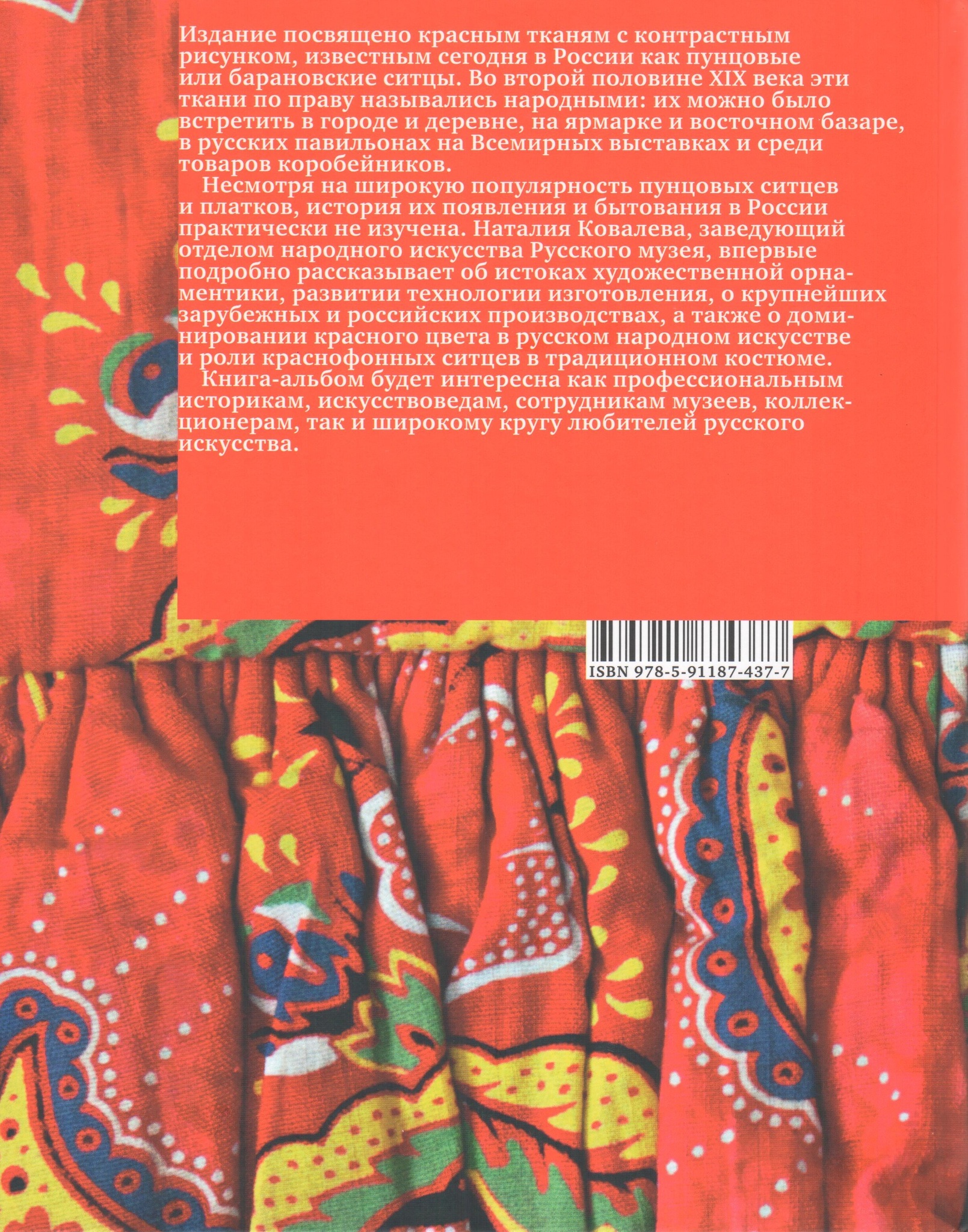 Несмотря на широкую популярность пунцовых ситцев и платков, история их появления и бытования в России практически не изучена. Наталия Ковалева, заведующий отделом народного искусства Русского музея, впервые подробно рассказывает об истоках художественной орнаментики, развитии технологии изготовления, о крупнейших зарубежных и российских производствах, а также о доминировании красного цвета в русском народном искусстве и роли краснофонных ситцев в традиционном костюме.
