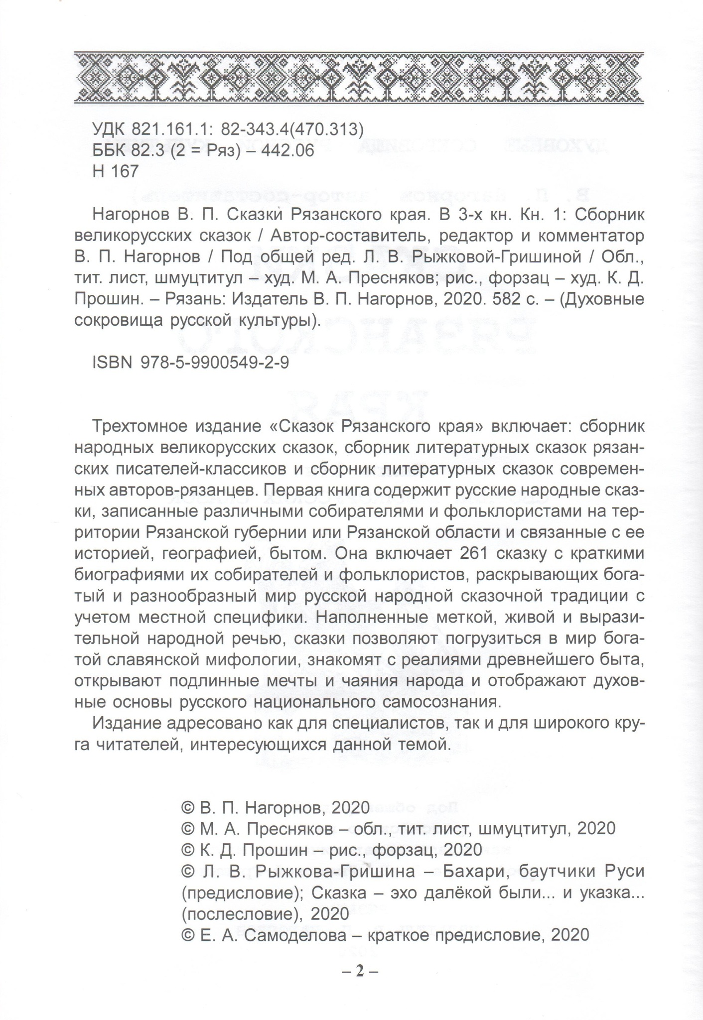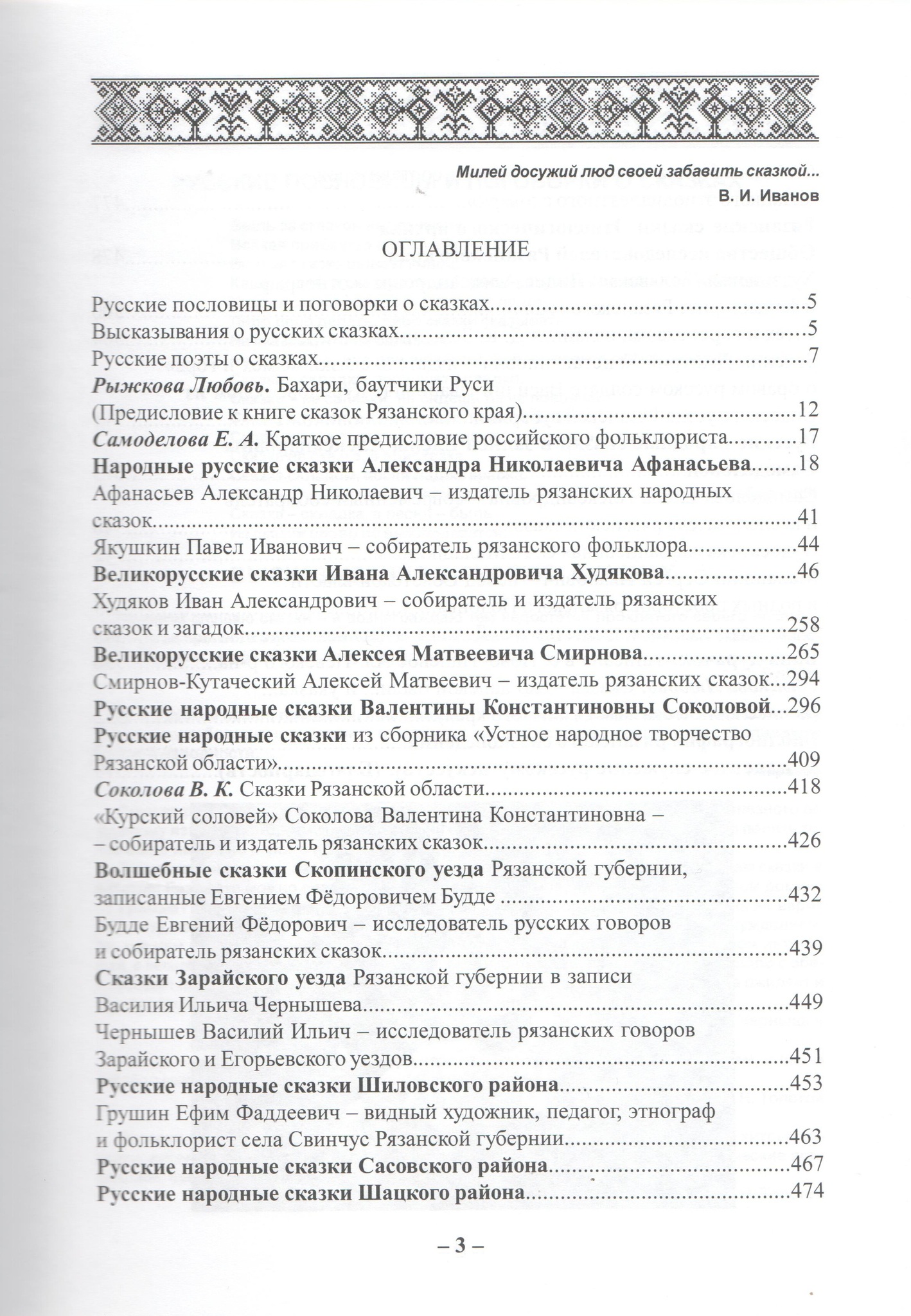 Трехтомное издание "Сказок Рязанского края" включает: сборник народных великорусских сказок рязанских писателей-классиков и сборник литературных сказок современных авторов-рязанцев. Первая книга содержит русские народные сказки, записанные различными собирателями и фольклористами на территории Рязанской губернии или Рязанской области и связанные с ее историей, географией, бытом.