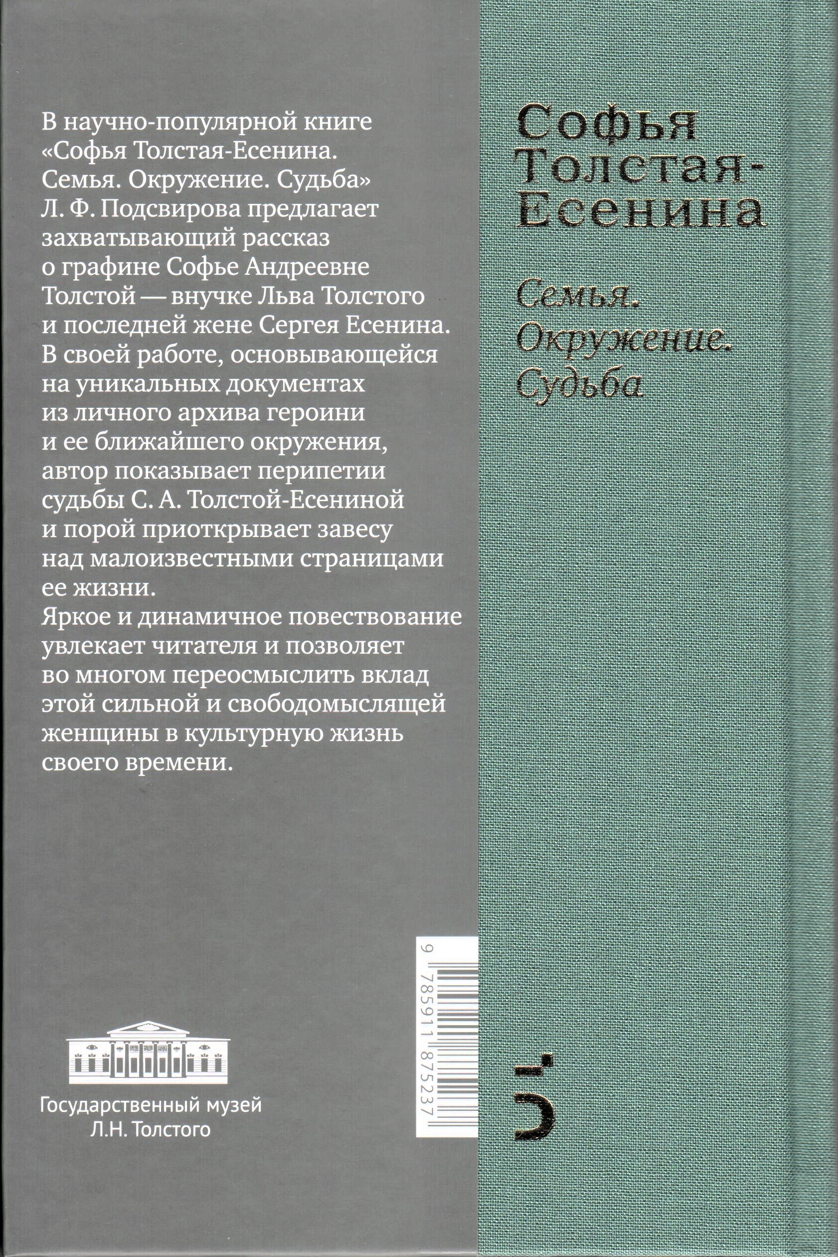 Научно-популярная книга Л.Ф. Просвировой представляет собой увлекательное исследование жизни и деятельности графини Софьи Андреевны Толстой (1900 - 1957) - внучки Льва Толстого и последней жены Сергея Есенина. В основу книги легли уникальные материалы из личного архива самой Софьи Толстой, а также архивов её родственников, друзей и знакомых. Читатель откроет для себя новые факты из истории России и отечественной литературы первой половины ХХ века, которые позволяют по-новому взглянуть на роль этой яркой и независимой женщины в литературной и музейной жизни той эпохи.