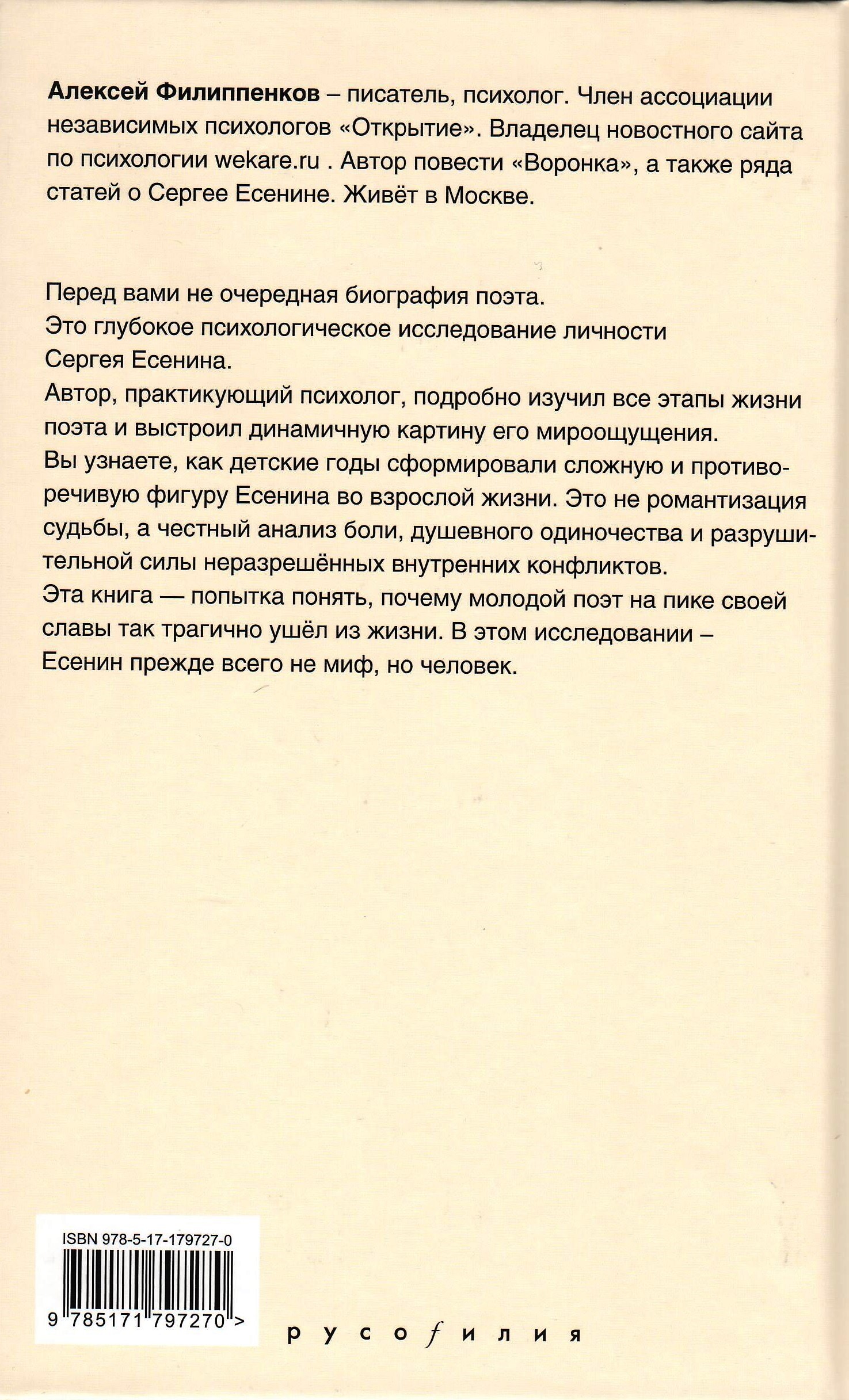 Перед вами не очередная биография поэта. Это глубокое психологическое исследование личности Сергея Есенина. Автор, практикующий психолог, подробно изучил все этапы жизни поэта и выстроил динамичную картину его мироощущения. Вы узнаете, как детские годы сформировали сложную и противоречивую фигуру Есенина во взрослой жизни. Это не романтизация судьбы, а честный анализ боли, душевного одиночества и разрушительной силы неразрешённых внутренних конфликтов. Эта книга - попытка понять, почему молодой поэт на пике своей славы так трагично ушёл из жизни. В этом исследовании - Есенин прежде всего не миф, но человек.