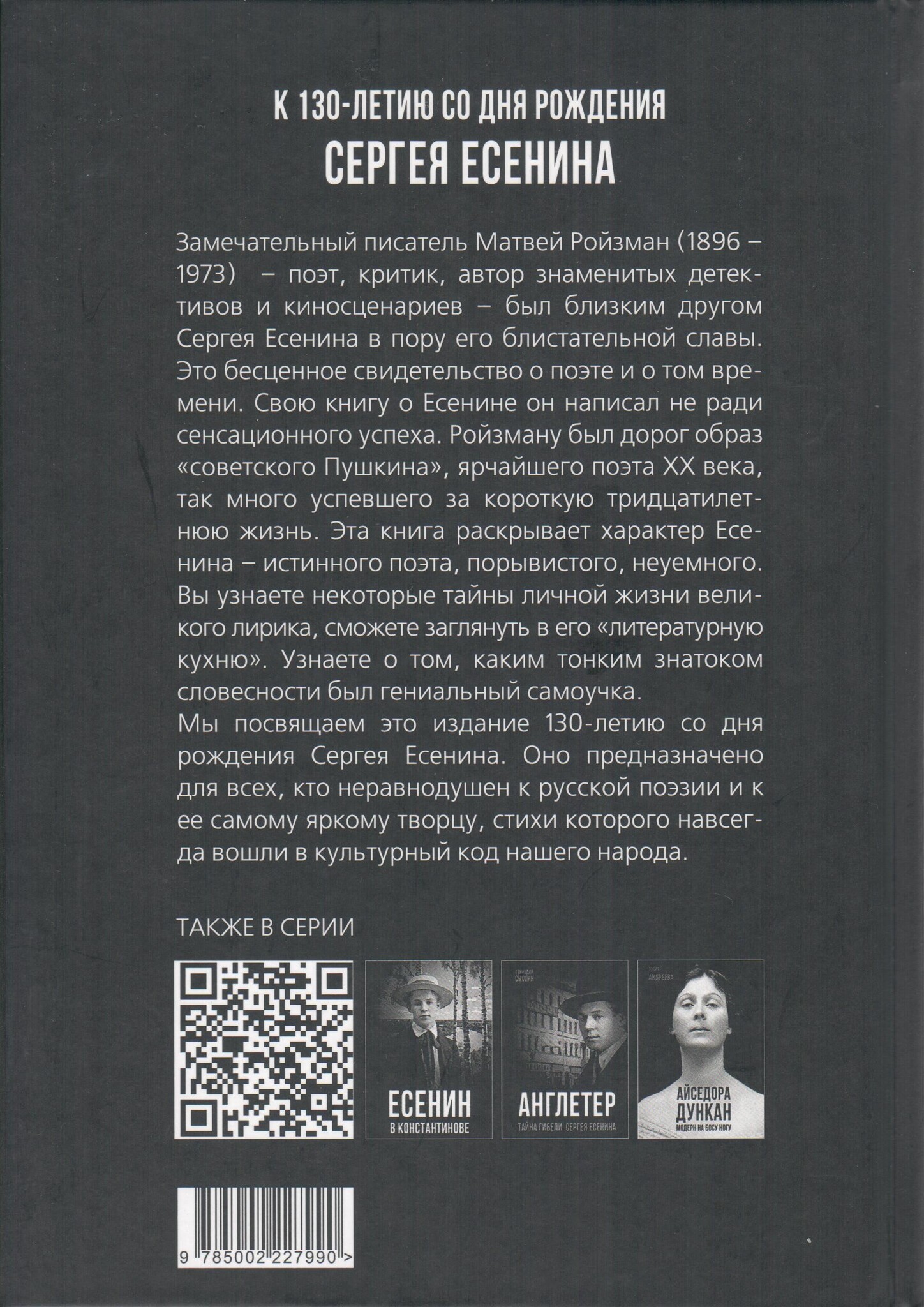 Замечательный писатель Матвей Давидович Ройзман (1896–1973) – поэт, критик, автор знаменитых детективов и киносценариев – был близким другом Сергея Есенина в пору его блистательной славы. Это бесценное свидетельство о поэте и о том времени. Свою книгу о Есенине он написал не ради сенсационного успеха. Ройзману был дорог образ «советского Пушкина», ярчайшего поэта ХХ века, так много успевшего за короткую тридцатилетнюю жизнь. Эта книга раскрывает характер Есенина – истинного поэта, порывистого, неуемного. Вы узнаете некоторые тайны личной жизни великого лирика, сможете заглянуть в его «литературную кухню». Узнаете о том, каким тонким знатоком словесности был гениальный самоучка.